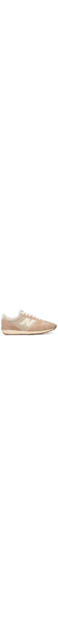 O tênis bege é produzido em material sintético. A peça possui bico arredondado, cano baixo, recortes em camurça com tom contrastante, lingueta com tag da marca aplicada e com faixa de gorgorão sobreposta, recorte lateral em material sintético com detalhe do logo da marca sobreposto, entressola branca, recorte posterior em borracha, solado emborrachado e fechamento superior por cadarço.