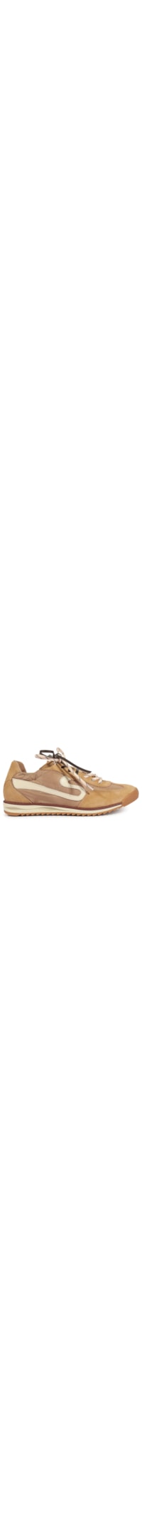 O tênis marrom é produzido em suede. A peça possui bico arredondado, cabedal em suede com recortes em material têxtil, detalhe lateral em material liso contrastante, lingueta acolchoada, palmilha lisa, entressola com detalhe contrastante, solado emborrachado com acabamento tratorado e fechamento por cadarço.