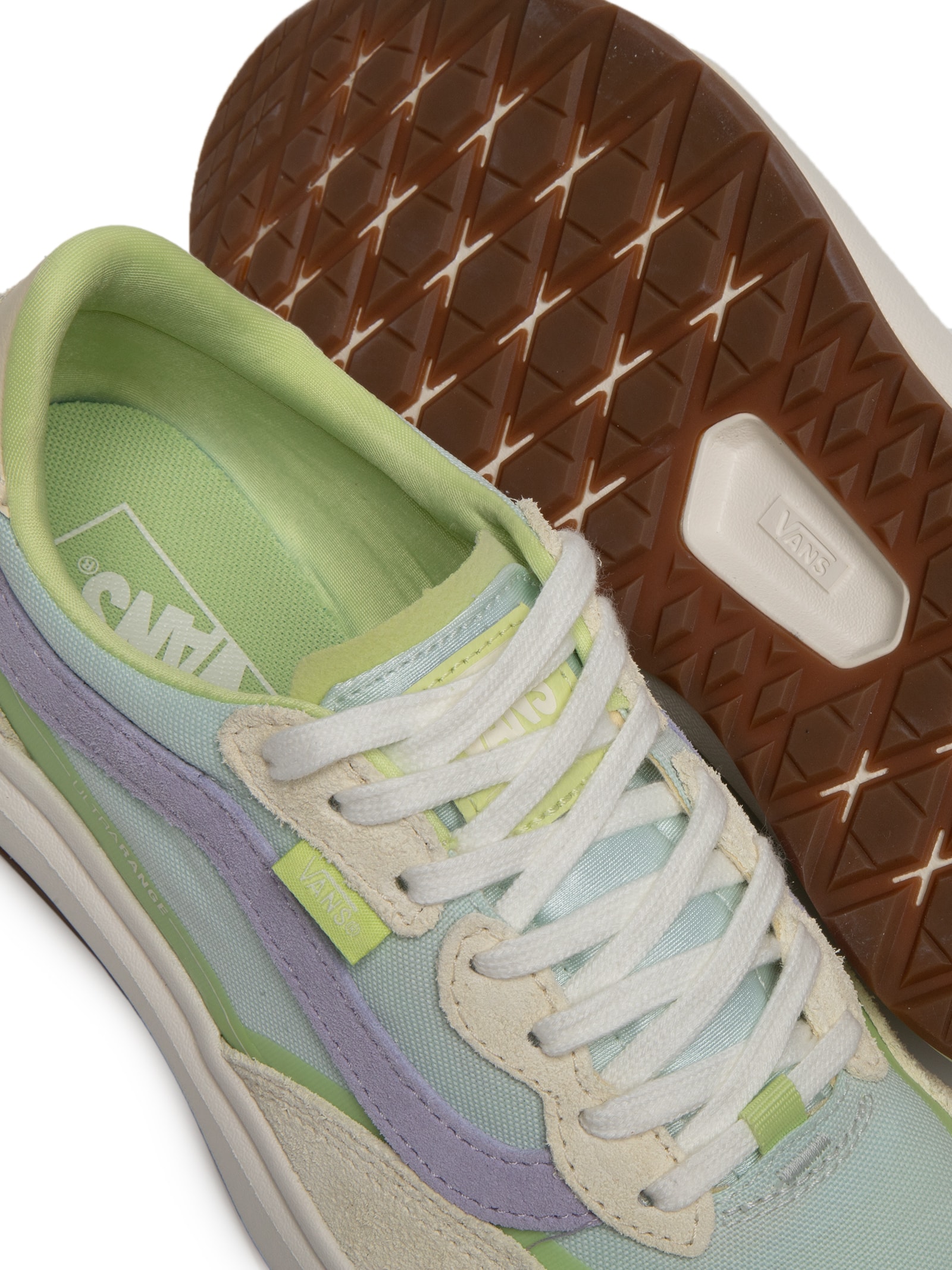 O tênis azul produzido em lona. A peça possui bico arredondado, cano baixo, recortes em nobuck bege, recortes em suede lilás nas partes laterais e posterior, recorte posterior em material sintético bege, forro em material têxtil verde, recortes laterais e na parte frontal em T.P.U. verde, escrita estampada na parte lateral na cor branca, entressola off white com recorte frontal com superfície texturizada, solado emborrachado e fechamento superior por cadarço.