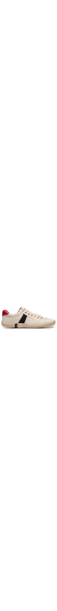 O tênis bege é produzido em lona. A peça de modelo riva possui bico arredondado, aplicação de ilhós na parte superior, logo da marca aplicado na lateral, recortes laterais sobrepostos em cor contrastante, recorte posterior acolchoado em couro de cor contrastante com nome da marca em relevo, palmilha macia, entressola em EVA, solado emborrachado com superior texturizada e detalhe em cor contrastante, acabamento pespontado e fechamento superior por amarração em cadarço.