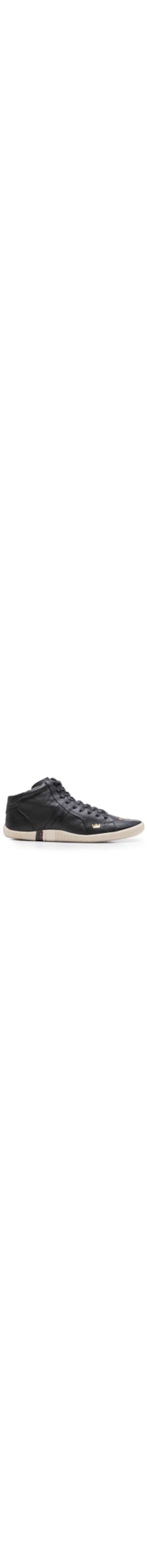 O tênis preto é produzido em couro. A peça possui bico arredondado, detalhe de ilhoses frontais, recorte posterior com nome da marca aplicado em relevo, logo da marca na cor dourada aplicada na lateral, entressola texturizada com detalhe de listras, cano baixo, solado emborrachado, acabamento pespontado e fechamento frontal por amarração.