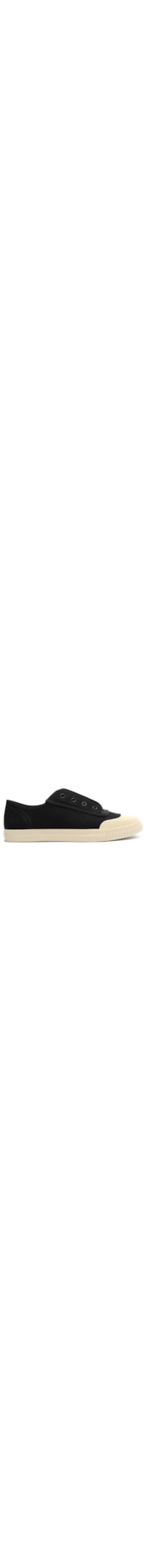 O tênis preto é produzido em lona. A peça possui bico arredondado, recorte frontal emborrachado com superfície texturizada, lingueta elástica com tag da marca aplicada, recortes laterais com aplicação de ilhóses, palmilha macia com nome da marca aplicado em cor contrastante, entressola emborrachada com detalhes texturizados e tag da marca aplicada na parte posterior e solado emborrachado.