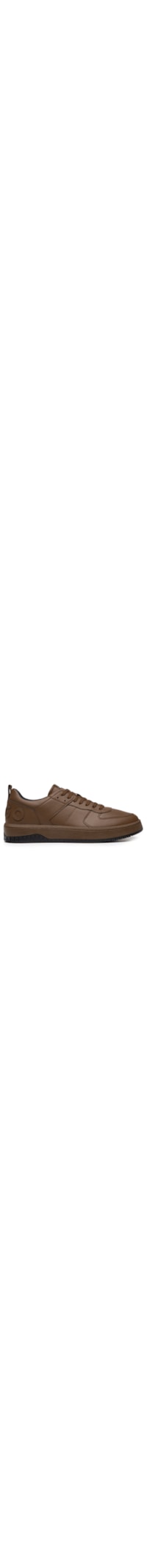 O tênis marrom é produzido em material sintético. A peça possui bico arredondado, recortes sobrepostos com superfície fosca, perfuros frontais e laterais, ilhóses laterais, tag da marca aplicada na lingueta, nome da marca aplicado em relevo na parte posterior, puxador posterior em grogurão com detalhes de frisos, forro acolchoado, palmilha macia com nome da marca em cor contrastante, entressola emborrachada com nome da marca em relevo na lateral, solado emborrachado e fechamento superior por cadarço.