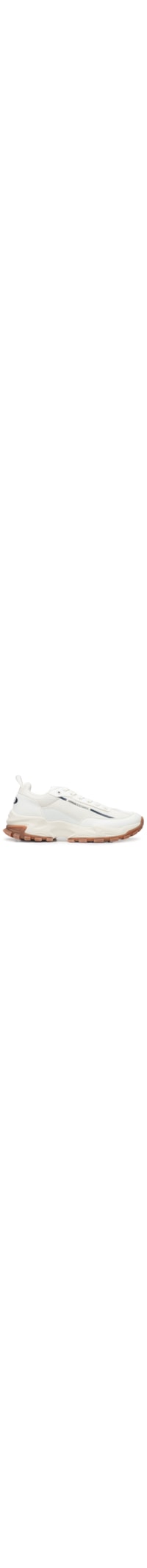 O tênis branco é produzido em mesh. A peça possui bico arredondado, recorte em camurça, recorte na superficie em couro, ilhós na lateal, recorte posterior em camurça com tag da marca em cor contrastante, puxador de gorgurão, logo da marca aplicado na lingueta, nome da marca applicado na lateral, forro acolchoado, palmilha macia, entressola em eva, solado emborrado e fechamento por cadarço.