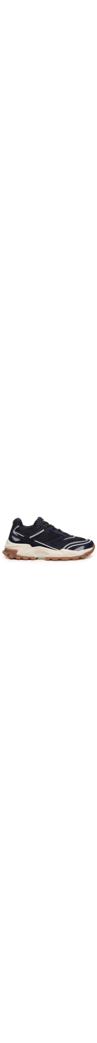 O tênis azul marinho é produzido em mesh. A peça possui bico arredondado, cano baixo acolchoado com forro, lingueta com tag da marca bordada, recortes em camurça, recortes em material sintético cinza, linha branca bordada nas partes frontal e laterais, logo da marca estampado na parte posterior, nome da marca estampado na cor branca na parte lateral, entressola com detalhes em relevo, solado emborrachado e fechamento superior por cadarço.