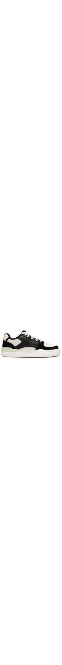 O tênis preto é produzido em mesh. A peça possui bico arredondado, cano baixo acolchoado com forro, lingueta com recorte em suede off white, recortes em camurça, recortes laterais em material sintético, nome da marca em baixo-relevo na parte lateral, logo da marca em baixo-relevo na parte posterior, recorte frontal e posterior em material sintético branco, recorte posterior em material sintético translucido, entressola com frisos e detalhes em relevo, solado emborrachado e fechamento superior por cadarço.