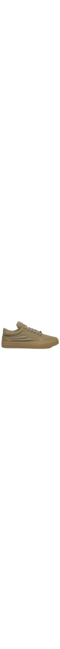 O tênis bege é produzido em material têxtil. A peça possui bico arredondado, detalhe lateral com tag da marca, recorte lateral com aplicação em relevo, palmilha macia com aplicação de logo, entressola texturizada, solado emborrachado com frisos e fechamento superior por cadarço.