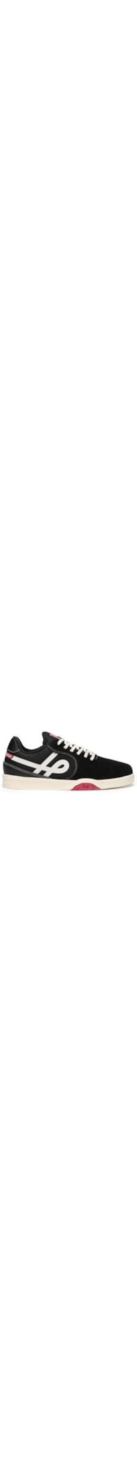 O tênis preto é produzido em camurça. A peça possui bico arredondado, cano baixo, recorte lateral, logo da marca emborrachado aplicado na lateral de cor off white, recorte posterior emborrachado na cor vermelha com o nome da marca e detalhe de listras, recorte posterior estendido para as laterais em couro, lingueta em mesh com tag da marca em cor contrastante, palmilha com o nome da marca aplicado, entressola emborrachada e texturizada na cor bege com recorte lateral em vermelho com nome da marca timbrado, solado texturizado e fechamento superior por cadarço.