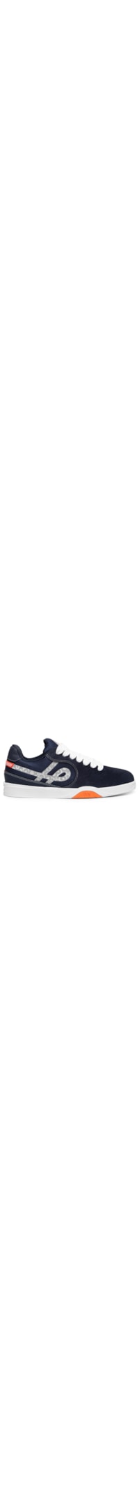 O tênis azul marinho é produzido em mesh. A peça possui bico arredondado, cano baixo acolchoado, tag da marca aplicada na lingueta, recorte frontal que se estende as partes laterais em camurça, recortes posteriores em material sintético, linhas laterais em T.P.U. na cor cinza e com efeito refletido, tag da marca aplicada em borracha na parte posterior, recorte posterior em material sintético laranja, entressola branca com recorte lateral laranja com detalhe do nome da marca em baixo-relevo, solado emborrachado e fechamento superior por cadarço.