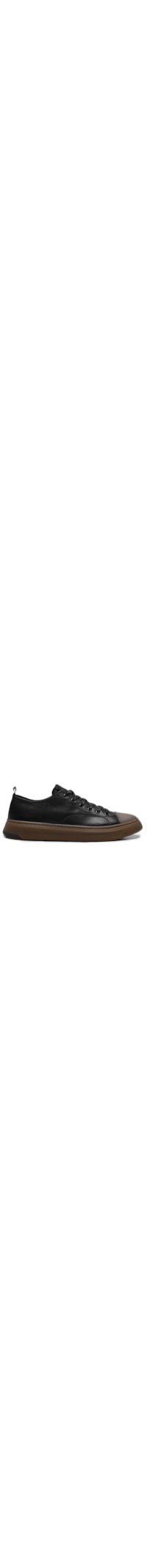 O tênis preto é produzido em couro. A peça possui bico arredondado, recorte frontal emborrachado, lingueta com tag da marca bordada, puxador posterior em gorgurão com padronagem de nome da marca, palmilha macia com tag da marca, entressola e solado emborrachado e ajuste superior por cadarço.