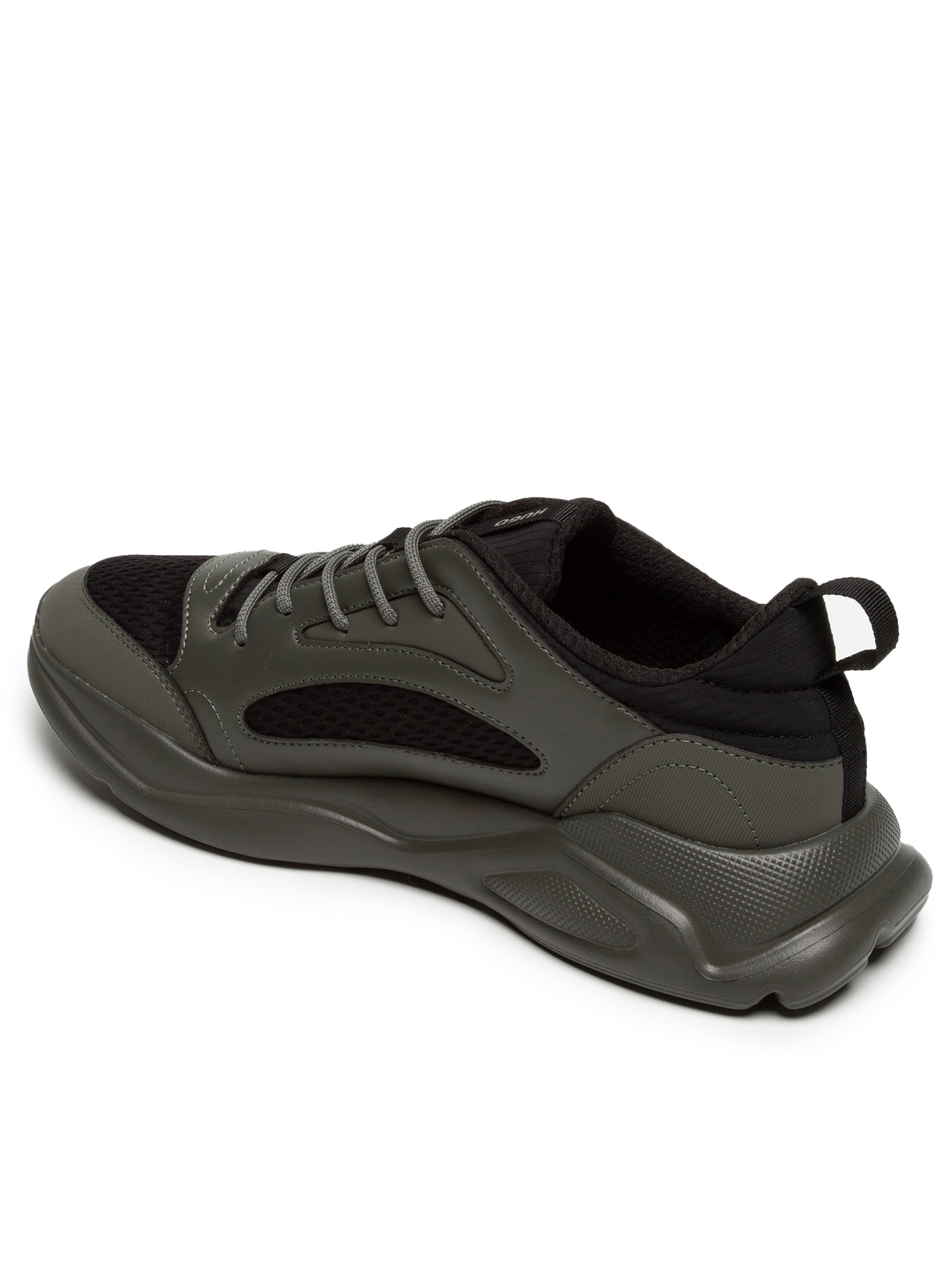 O tênis verde é produzido em mesh. A peça possui bico arredondado, cano baixo com forro preto, lingueta preta em material têxtil e com faixa de gorgurão com puxador e nome da marca, recortes em material sintético tendo o recorte frontal e posterior superfície texturizada, recorte posterior em material têxtil, faixa de gorgurão preta sobreposta na parte posterior com puxador, entressola com detalhes em relevo, superfície texturizada nas partes laterais e posterior e com detalhe do nome da marca em relevo na parte lateral, solado emborrachado e fechamento superior por cadarço.