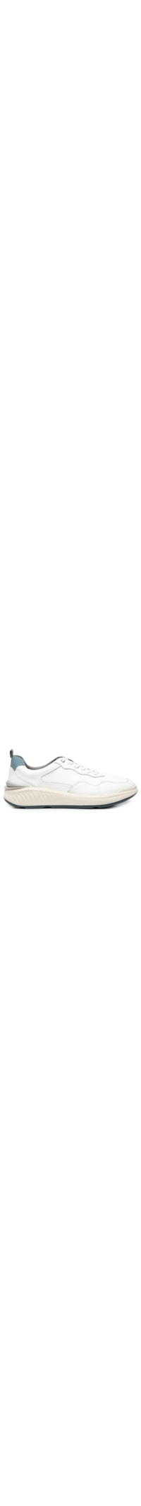 O tênis branco é produzido em couro. A peça possui bico arredondado, recortes frontais e laterais, recorte posterior em cor contrastante, recorte aplicado na lingueta em cor contrastante, aplicação de gorgurão na região posterior, palmilha macia, entressola texturizada em EVA, solado emborrachado e fechamento superior por amarração de cadarço.