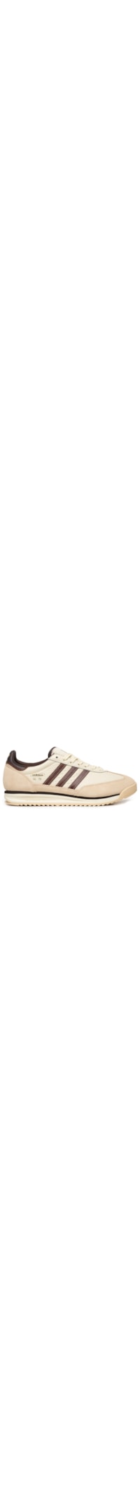 O tênis bege é produzido em couro. A peça possui bico arredondado, cabedal com recortes em camurça, laterais com as icônicas três listras em tom contrastante, tag da marca aplicada na lingueta em tecido, logo aplicado na lateral, colar acolchoado, palmilha macia com estampa personalizada, entressola com detalhe em friso contrastante, solado emborrachado texturizado e fechamento por cadarço.