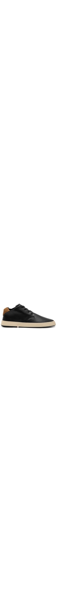 O tênis preto é produzido em couro. A peça possui bico arredondado, cano médio, recorte em camurça de cor contrastante aplicado na parte posterior com nome da marca, detalhe de ilhoses na parte lateral, palmilha macia, entressola em borracha de contrastante com parte frontal e posterior texturizadas e nome da marca na lateral, solado emborrachado, acabamento pespontado e fechamento superior por cadarço.