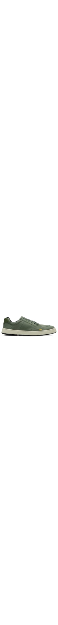 O tênis verde é produzido em lona. A peça possui bico arredondado, cano baixo, recortes, logo da marca estampado na parte lateral em cor contrastante, recorte posterior em couro com nome da marca em baixo-relevo, entressola texturizada em cor contrastante com nome da marca na parte lateral em baixo-relevo, solado emborrachado, acabamento pespontado e fechamento superior por cadarço.
