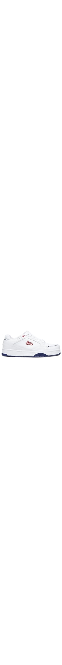 O tênis branco é produzido em couro. A peça possui bico arredondado, recortes sobrepostos com detalhe de pespontos, recorte frontal na cor azul, detalhe superior de perfuros, recorte lateral em mesh, logo da marca emborrachado aplicado em vinho na lateral, recortes posteriores em material refletivo, lingueta em mesh acolchoada com tag emborrachada da marca, entressola texturizada com recortes e nome da marca em baixo relevo, solado texturizado e fechamento superior por cadarço com tag metálica da marca removível embutida.