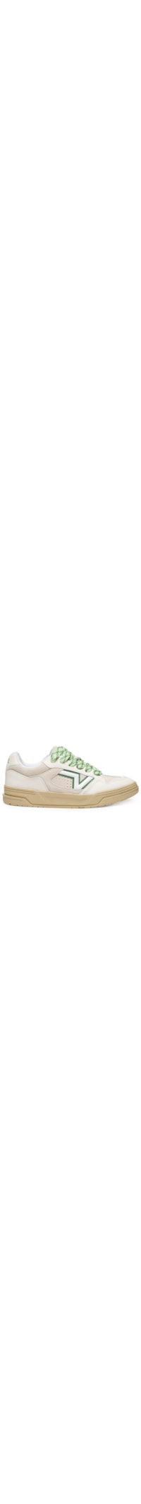 O tênis bege produzido em camurça. A peça possui bico arredondado, cano baixo acolchoado, forro em material têxtil branco, lingueta acolchoada e com tag da marca bordada, recortes em couro, perfuros nas partes laterais e frontal, logo da marca aplicado nas partes laterais em material sintético com cores contrastantes, nome da marca estampado na cor verde na parte posterior, entressola em tom contrastante com detalhes em relevo, frisos e superfície texturizada nas partes posterior e frontal, solado emborrachado e fechamento superior por cadarço.