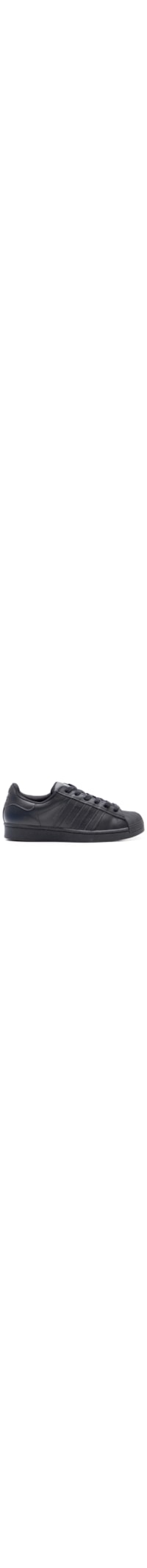 O tênis preto é produzido em couro. A peça de modelo superstar possui bico arredondado, recorte frontal e lateral texturizado, recorte posterior com logo da marca aplicada, perfuros laterais, solado emborrachado, palmilha macia, detalhe em pesponto e fechamento por cadarço.