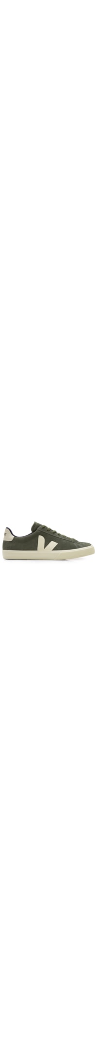 O tênis verde é produzido em camurça. A peça possui bico aredondado, cano baixo, recorte posterior em couro de cor contrastante com nome da marca, logo da marca sobreposto nas partes laterais, logo e nome da marca timbrado na lingueta e parte lateral, entressola em cor contrastante texturizada nas partes frontal e laterais, solado emborrachado, acabamento pespontado e fechamento superior por cadarço.