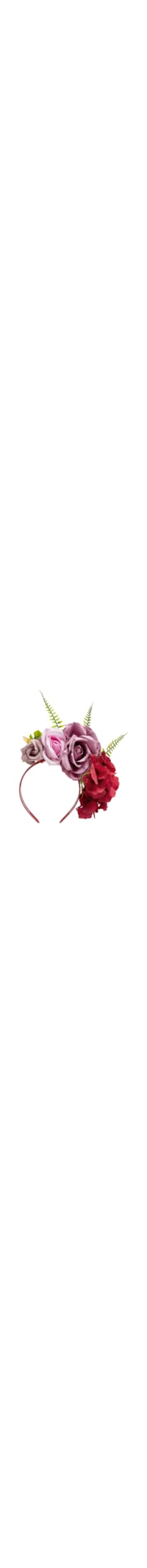 A tiara vermelha é produzido em material sintético. A peça possui estrutura de arco e aplicação de folhagens e flores sintéticas na parte superior.