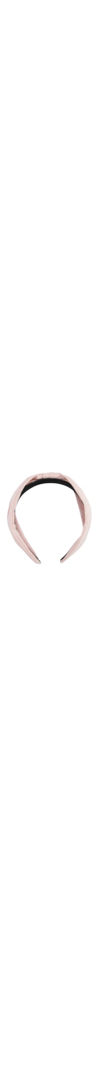 A tiara rosa é produzida em material têxtil com fios em lurex. A peça possui arco flexível revestido, detalhe de tira superior e espessura larga.