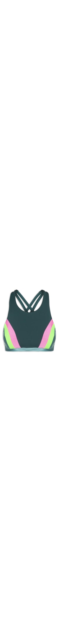 O top verde é confeccionado em malha de poliamida. A peça possui decote redondo, alças médias cruzadas na parte posterior, cavas estendidas, bojo removível, recortes em cores contrastantes na parte frontal, tag emborrachada da marca aplicada na parte posterior, comprimento cropped, shape justo, caimento reto e acabamento elástico.