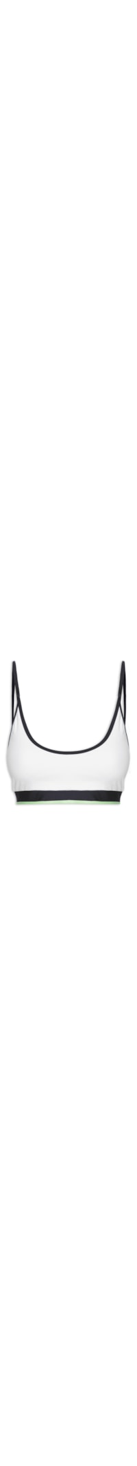 O top branco é confeccionado em malha leve de alta elasticidade. A peça justa ao corpo, possui decote em U, alças finas com tag da marca aplicada na parte frontal e regulagem, bojo removível, barra em cores contrastantes com elástico embutido e forro.