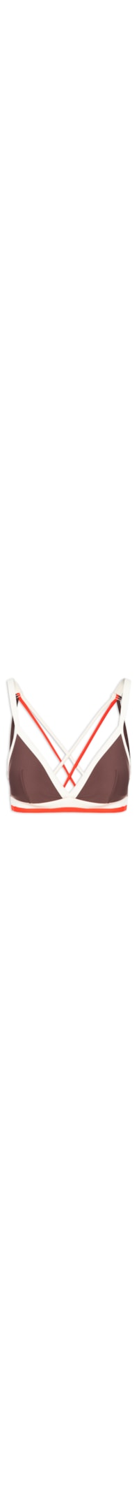 O top marrom é confeccionado em malha justa com alta elasticidade. A peça possui decote V, alças finas cruzadas e com detalhe triplo em cores contrastantes na parte posterior, recortes frontais e alças na cor off white, bojo, forro, pences frontais, barra recortes e elástico embutido e tag da marca emborrachada aplicada na parte posterior.
