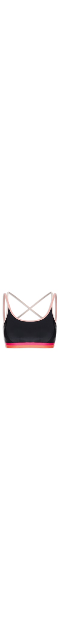 O top preto é confeccionado em malha justa com alta elasticidade. A peça possui decote U, alças finas duplas em cores contrastantes e cruzadas na parte posterior, tag da marca aplicada na parte posterior, bojo, recortes frontais, barra com recortes nas cores rosa e laranja, forro e comprimento cropped*.