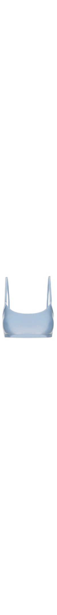 O top azul é confeccionada por malha de poliamida com alta elasticidade. A peça justa ao corpo possui decote redondo, alças finas com ajuste, recorte frontal, bojo embutido, elástico embutido na barra, tag da marca emborrachada na barra posterior e comprimento curto.