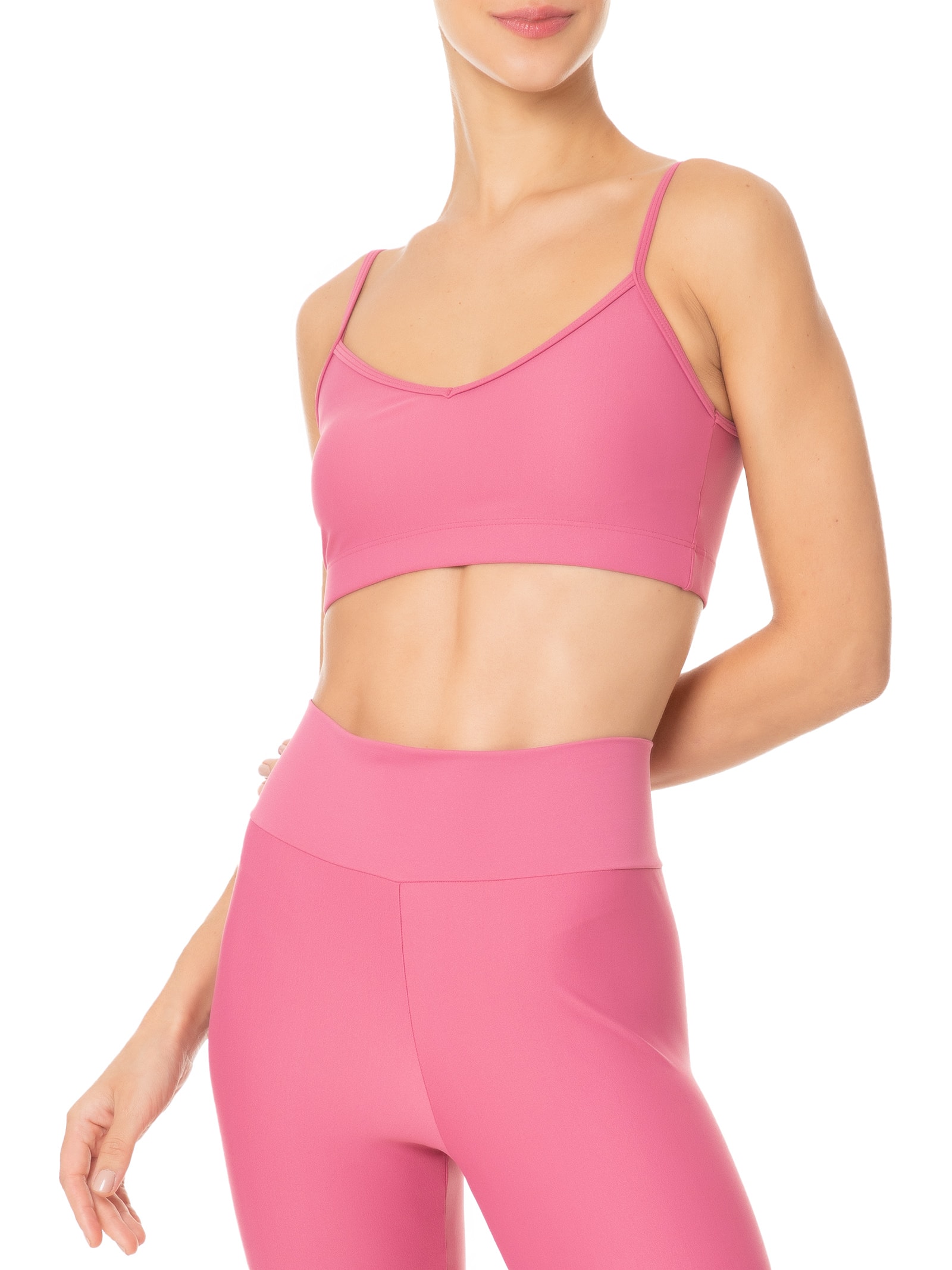 O top rosa é confeccionado em malha justa com alta elasticidade. A peça possui decote frontal V profundo e posterior em U, alças finas, cavas estendidas, tag da marca aplicada na parte posterior, bojo, elástico embutido na barra e comprimento cropped*.