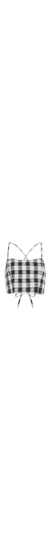 O top preto é confeccionado em tecido leve. A peça possui decote quadrado, alças finas, cavas regulares, padronagem em xadrez com cor contrastante, detalhe de tiras cruzadas na parte posterior, comrpimento cropped, shape justo, caimento reto, acabamento pespontado e fechamento posterior por tira de amarração.