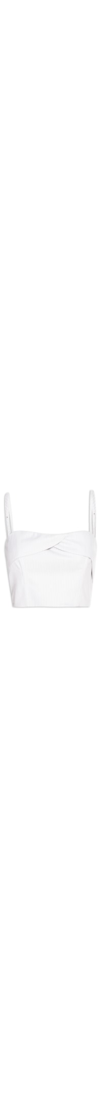O top cinza é confeccionado em tecido leve sem elasticidade. A peça justa ao corpo possui decote reto, alças finas com regulagem, cavas regulares, recorte posterior, sobreposição frontal com detalhe de transpasse, padronagem risca de giz na cor branca, comprimento cropped* e fechamento posterior por zíper.