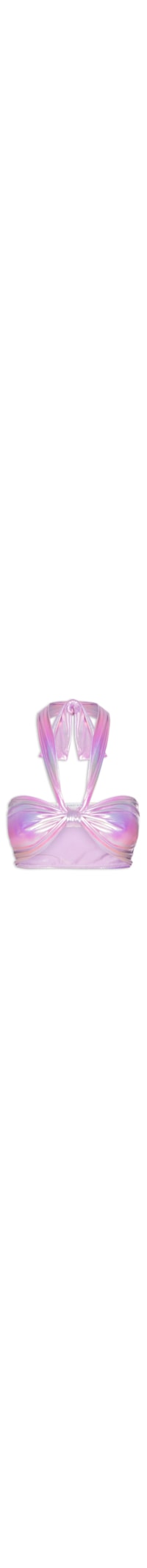 O top lilás é confeccionado em malha cirrê com superfície holográfica e alta elasticidade. A peça possui decote coração, alças médias com detalhe de nó na parte frontal e alongadas para amarração posterior, sem bojo, comprimento cropped* e acabamento elástico.