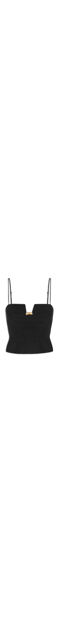 O top preto é confeccionado em tecido estruturado com toque de linho. A peça justa ao corpo possui decote reto, alças finas ajustáveis, recorte frontal com detalhe em metal dourado removível. pala levemente ampla na área da cintura, lastéx aplicado na parte posterior, comprimento cropped* e fechamento posterior por zíper.
