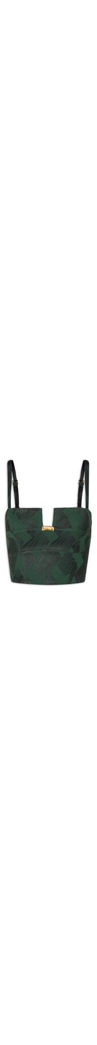 O top verde é confeccionado em tecido encorpado sem elasticidade. A peça justa ao corpo possui decote reto, alças finas reguláveis, recorte frontal com detalhe em metal dourado removível, pala levemente ampla na área da cintura, lastex aplicado na parte posterior, comprimento cropped* e fechamento posterior por zíper metálico.