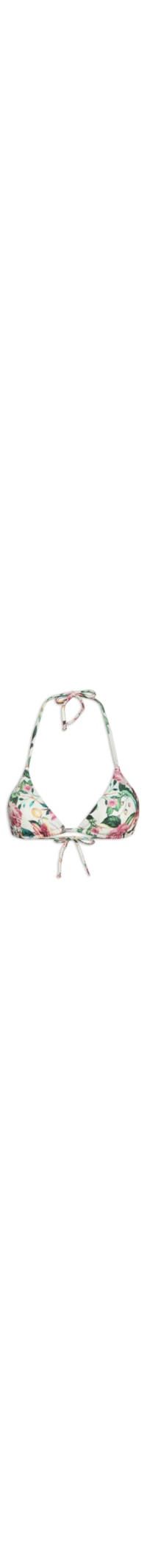 O top off white é confeccionado em malha de poliamida com média elasticidade. A peça de modelo cortininha possui alças finas e alongadas para amarração, estampa floral em cores contrantes, forro, bojo removível e fechamento posterior por tiras alongadas para amarração.