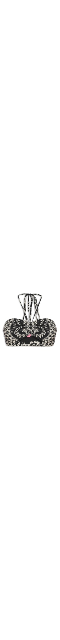 O top preto é confeccionado em tecido leve sem elasticidade. A peça justa ao corpo possui decote coração com detalhes de franzidos, tiras finas estendidas para amarração posterior, recortes posteriores com lastex embutidos, mix de estampa na cor bege e forro.