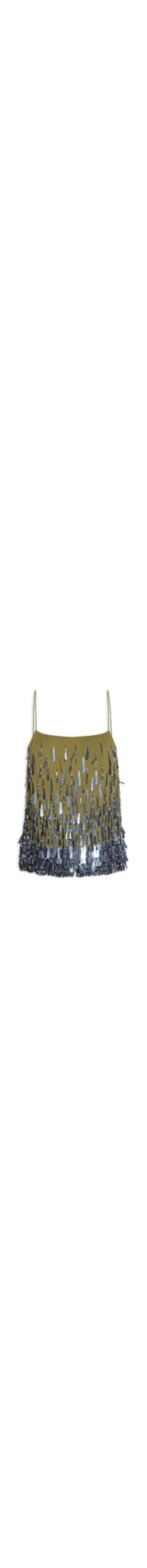 O top verde é confeccionado em tecido leve sem elasticidade. A peça solta ao corpo possui decote V, alças finas, aplicação de paetês em formato de gota e canutilhos metalizados, barra assimétrica e forro.
