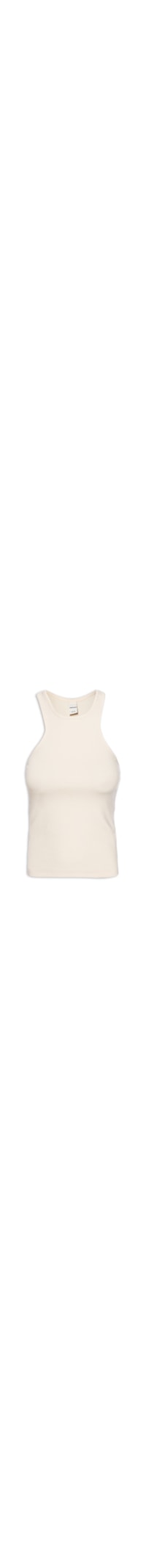O top bege é confeccionado em malha canelada com alta elasticidade. A peça justa ao corpo possui decote redondo, cavas regulares e recorte nadador na parte frontal e posterior.