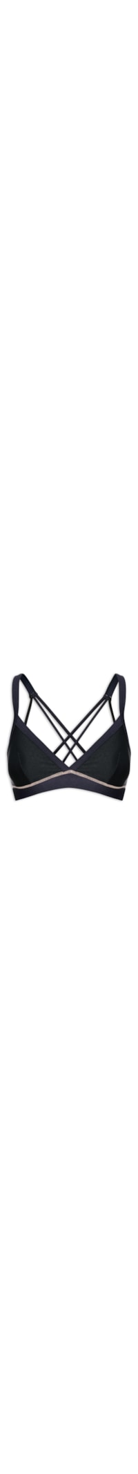 O top preto é confeccionado em malha de poliamida com alta elasticidade. A peça justa ao corpo possui decote em V, alças finas elásticas, pences na parte frontal, recortes na cor azul, detalhe pespostado na barra em cor contrastante, alças finas sobrepostas na parte posterior, forro, bojo, barra elástica e tag da marcada aplicada na barra posterior.