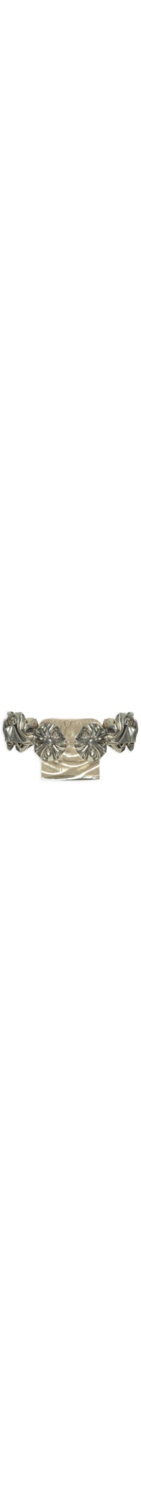 O top prateado é confeccionado em malha cirrê com superfície metalizada e baixa elasticidade. A peça justa ao corpo de modelo tomara que caia possui decote reto, mangas curtas removíveis e bufantes com efeito drapeado, parte frontal em tule com aplicação figurativa de maxi flor e comprimento cropped*.