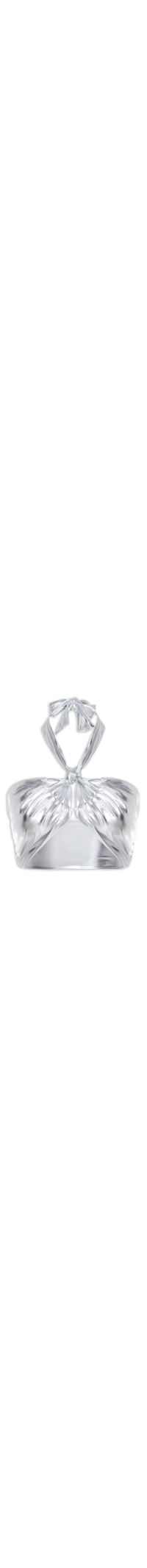 O top prata é confeccionado em malha com superfície metalizada. A peça possui decote trapézio com detalhe de nó frontal, alças médias, comprimento cropped, acabamento pespontado e fechamento posterior por amarração.
