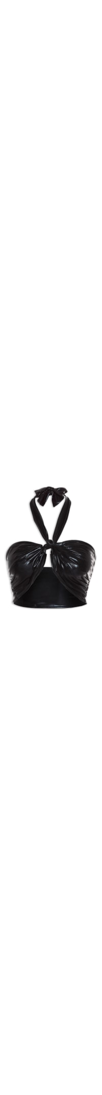 O top preto é confeccionado em malha com superfície metalizada. A peça possui decote trapézio com detalhe de nó frontal, alças médias, comprimento cropped, acabamento pespontado e fechamento posterior por amarração.