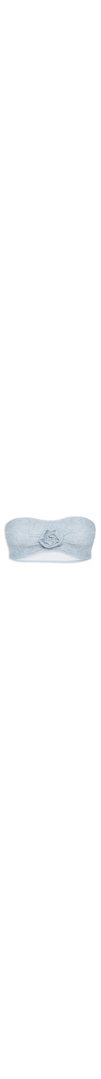 O top azul é confeccionado em malha leve com fios de lurex aplicados e com média elasticidade. A peça justa ao corpo de modelo tomara que caia, possui decote reto, franzido frontal com aplicação de flor e elástico embutido nas partes superior e inferior.