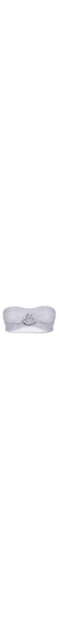 O top roxo é confeccionado em malha leve com fios de lurex aplicados e com média elasticidade. A peça justa ao corpo de modelo tomara que caia, possui decote reto, franzido frontal com aplicação de flor e elástico embutido nas partes superior e inferior.