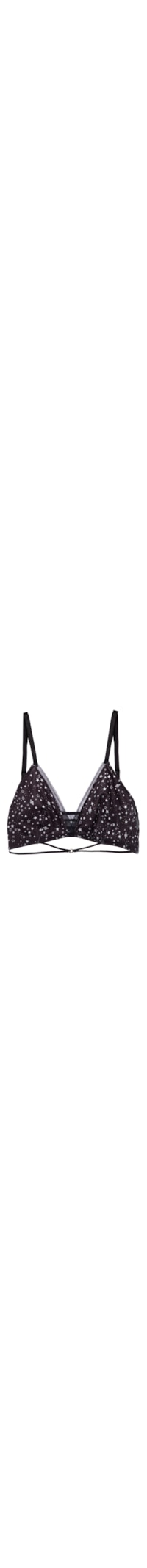 O top preto é confeccionado em malha de poliamida. A peça possui decote V com recortes em tule, alças finas reguláveis, pences frontais, barbatanas embutidas para sustentação nas laterais, recorte posterior em tule, detalhes de transparência, faixa elástica embutida na barra, tiras elásticas com aplicação de argola metalizada na altura da barra, mix de estampa em cor contrastante com aplicação de glitter, shape justo, caimento reto e acabamento elástico.
