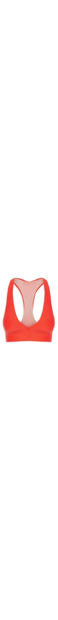 O top laranja é confeccionado em malha de poliamida. A peça possui decote frontal em V e posterior nadador com detalhes de franzido, alças médias, cavas regulares, recorte frontal abaixo do busto, bojo removível, tag da marca de cor metálica aplicada na parte posterior, forro em tule, comprimento cropped* e shape justo.