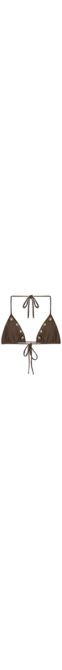 O biquíni marrom é confeccionado em malha leve com média elasticidade. O top de modelo cortininha possui decote triângulo, alças finas alongadas, laterais finas, aplicações metálicas frontais, forro e fechamento posterior por amarração. A calcinha possui cintura baixa, laterais finas com elástico embutido, aplicações metálicas na parte frontal e forro.