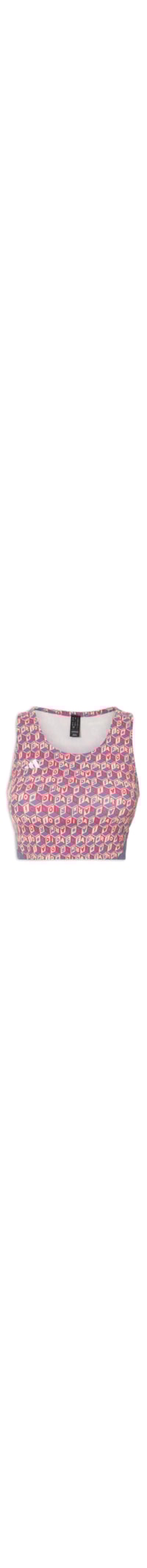 O top azul é confeccionado em malha com alta elasticidade. A peça justa ao corpo possui decote U, alças médias, logo da marca aplicado em material refletivo na altura do busto, recortes laterais estendidos para a parte posterior em mesh de cor contrastante, estampa geométrica com monograma da marca em cores contrastantes, sem bojo e comprimento cropped**.